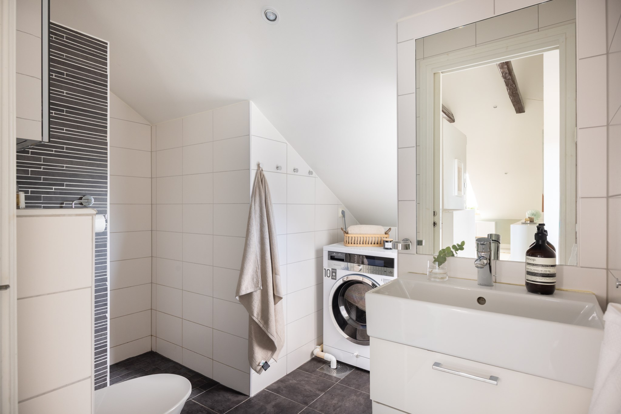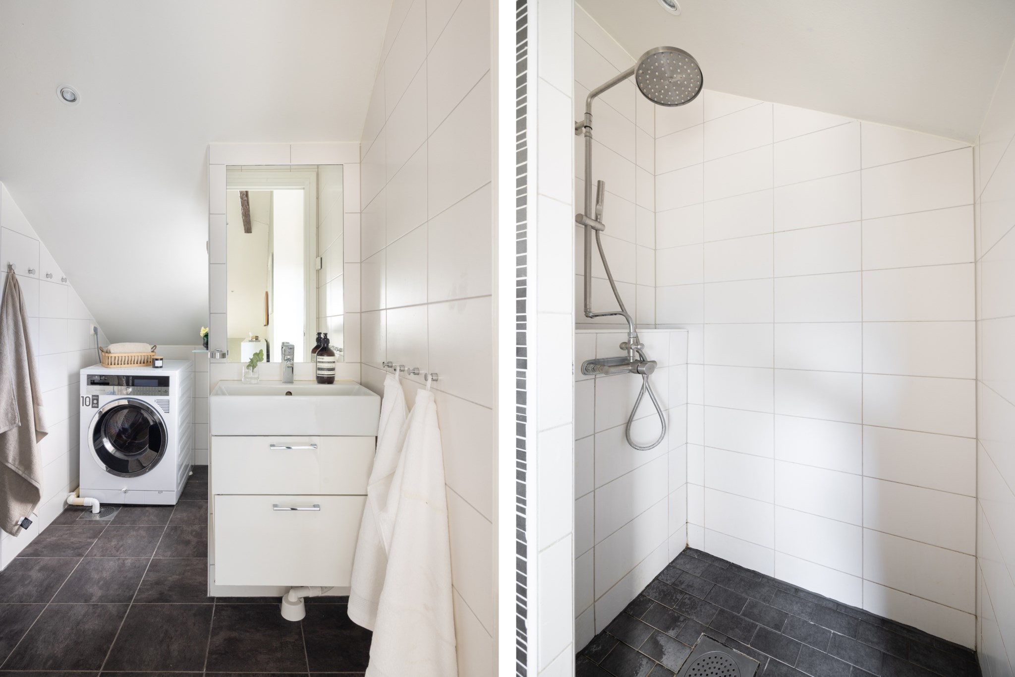 Rymligt badrum med tidlösa materialval bestående av ljust kakel och mörkt klinker. Badrumme är utrustat med WC, handfat med kommod, dusch samt bekvämligheter som tvättmaskin. Perfekt belysning via spotlights i tak.