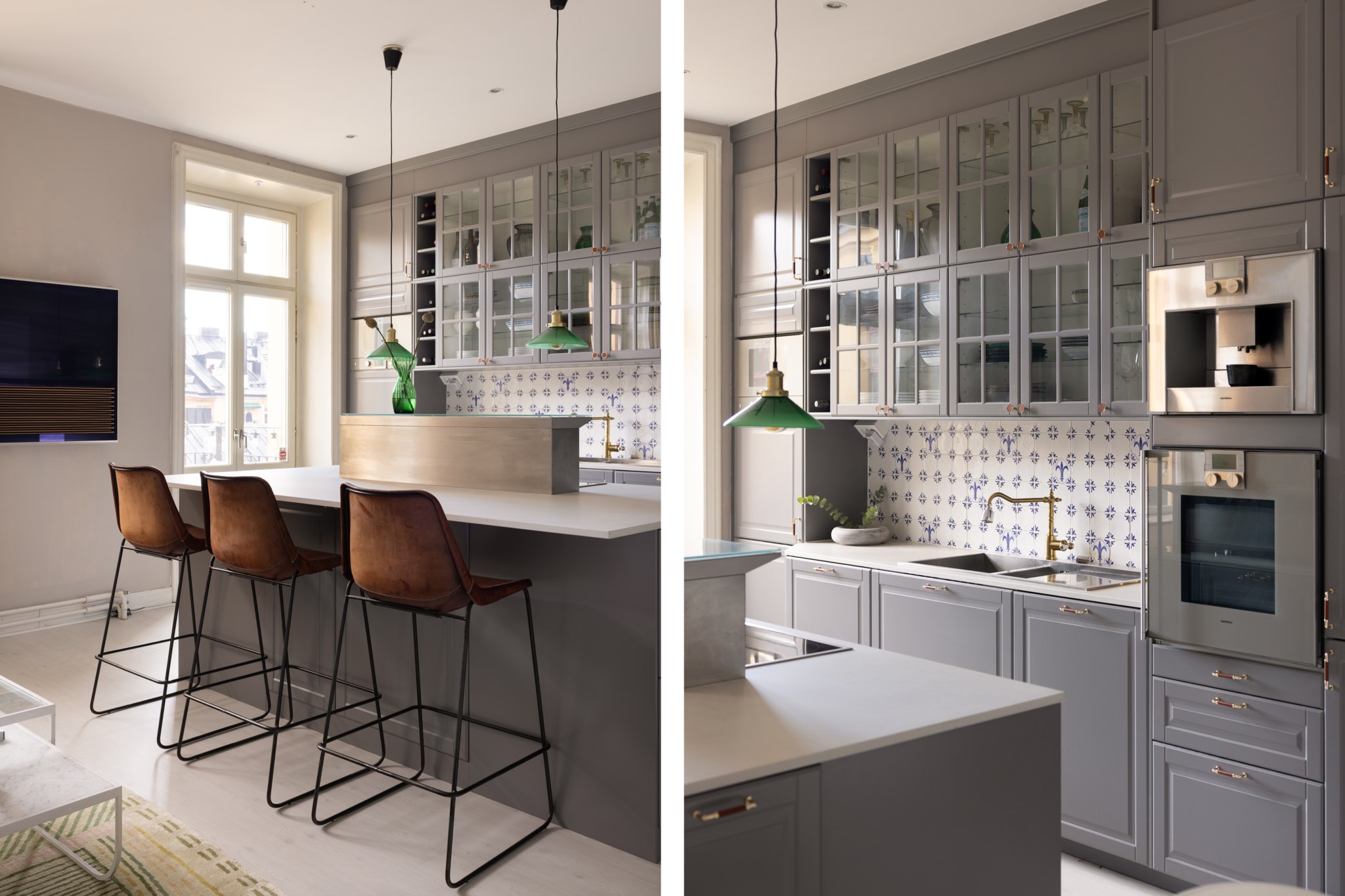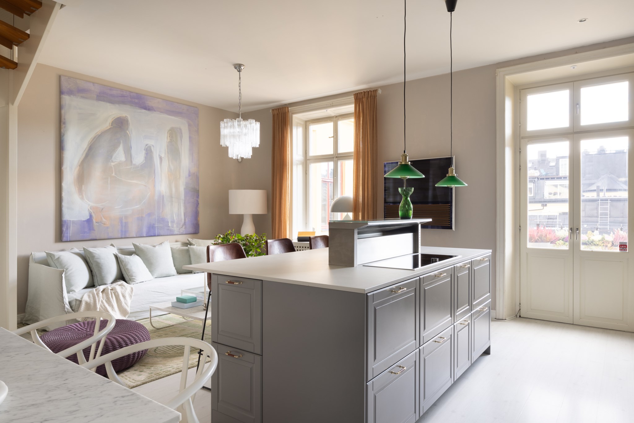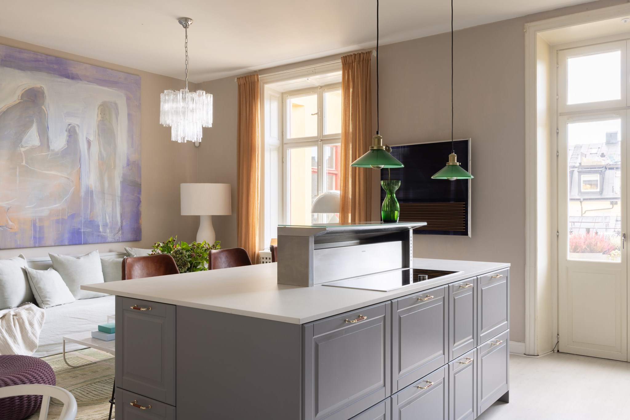 Trevligt kök i öppen planlösning med köksö vardagsrum. Intill köksön finns given plats för tre barstolar. Smakfulla materialval bestående av köksluckor i grå nyans med delvis vitrin samt ljus bänkskiva. Köket är utrustat med diskho, spishäll (Gaggenau), köksfläkt, inbyggd ugn och mikro, diskmaskin, inbyggd kaffemaskin samt kyl och frys. Från köket nås även den mysiga balkongen via dubbeldörrar.