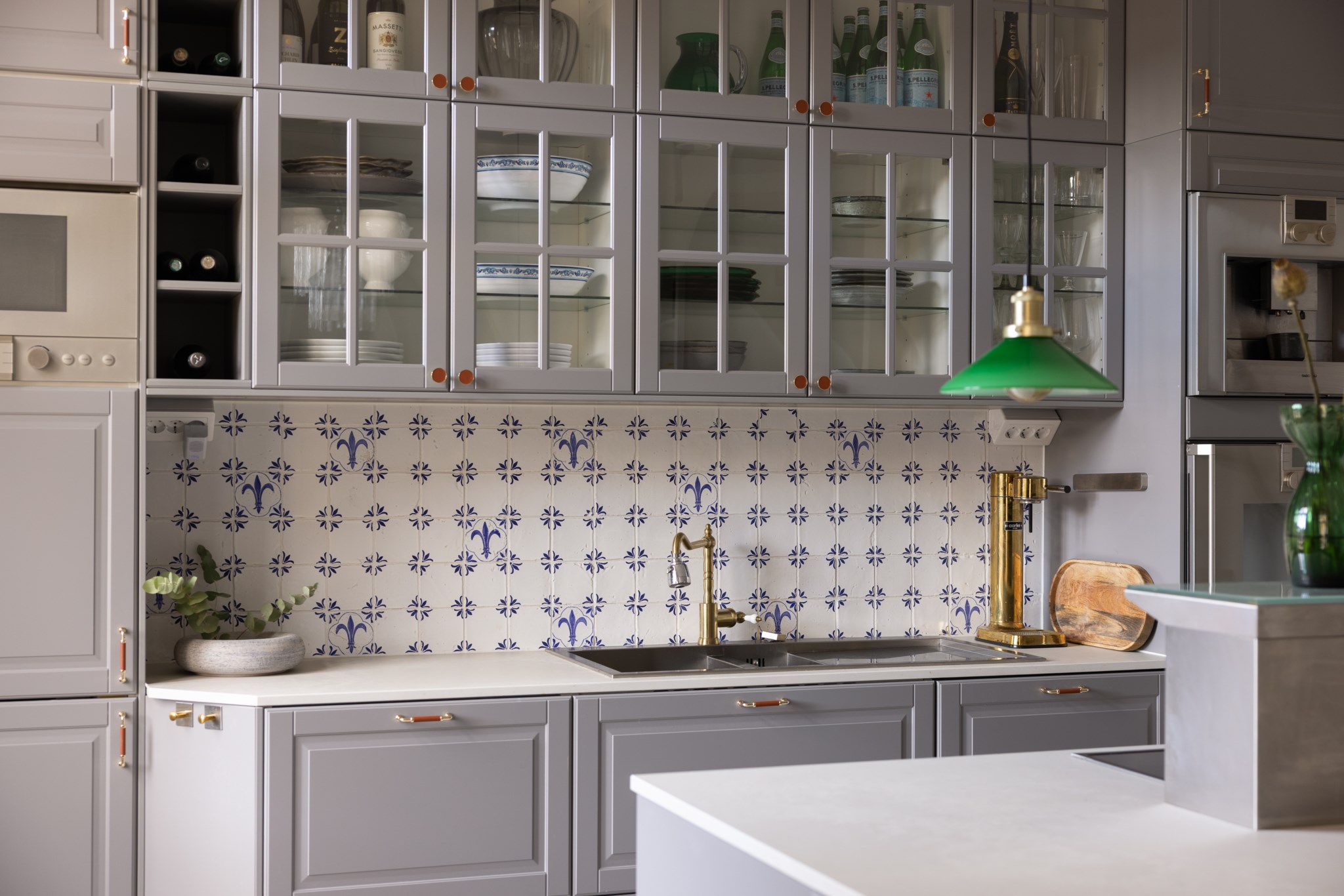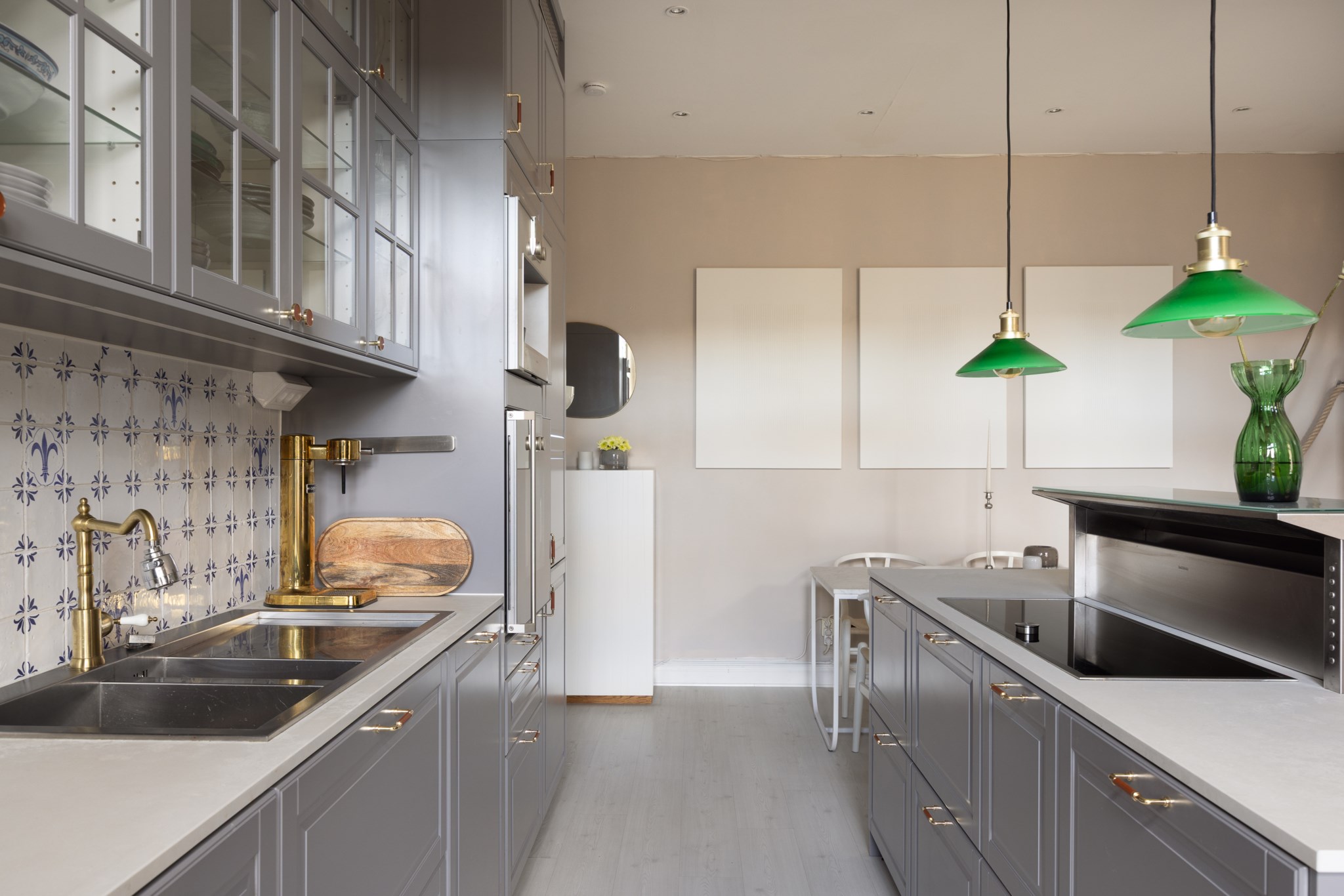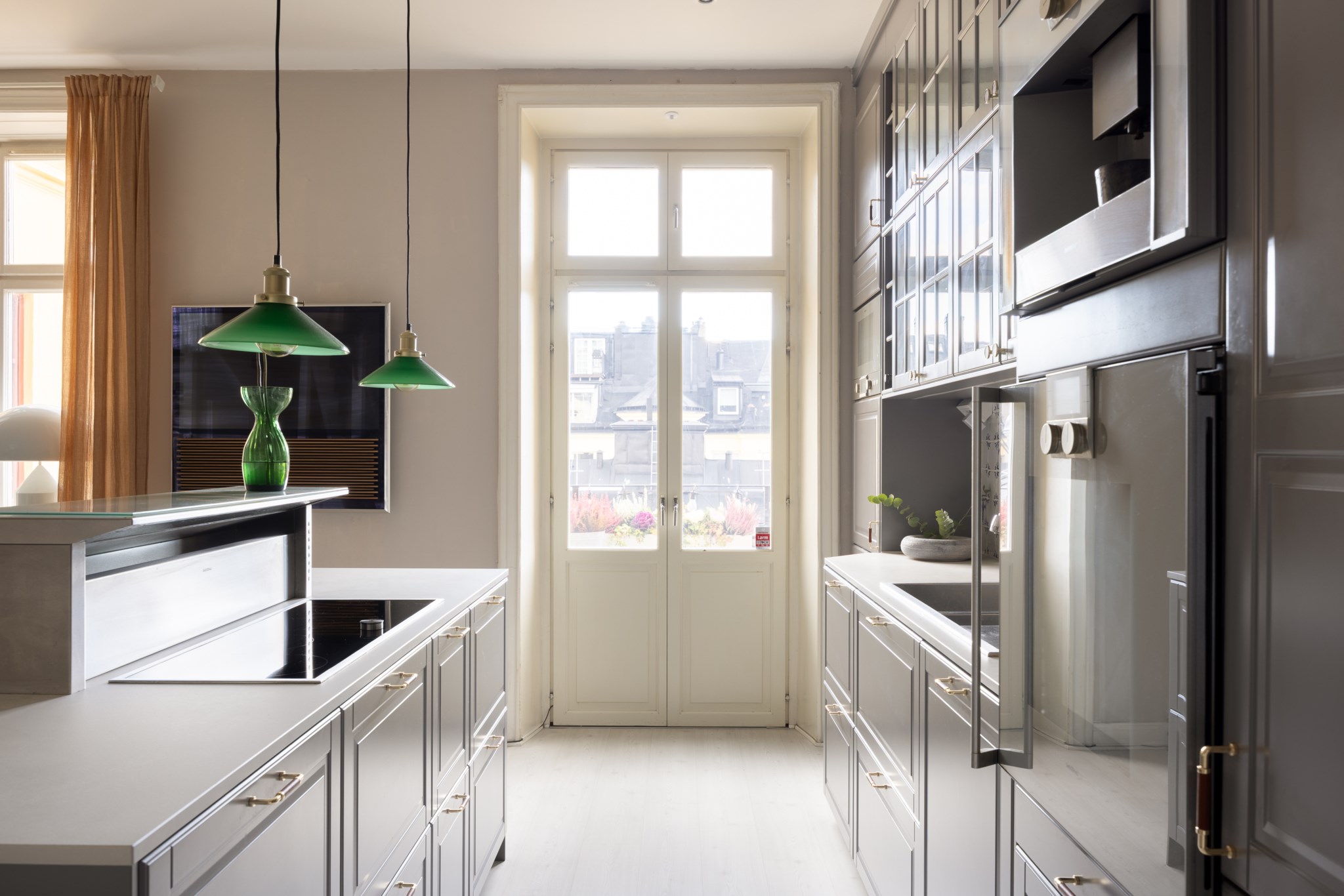 Trevligt kök i öppen planlösning med köksö vardagsrum. Intill köksön finns given plats för tre barstolar. Smakfulla materialval bestående av köksluckor i grå nyans med delvis vitrin samt ljus bänkskiva. Köket är utrustat med diskho, spishäll (Gaggenau), köksfläkt, inbyggd ugn och mikro, diskmaskin, inbyggd kaffemaskin samt kyl och frys. Från köket nås även den mysiga balkongen via dubbeldörrar.