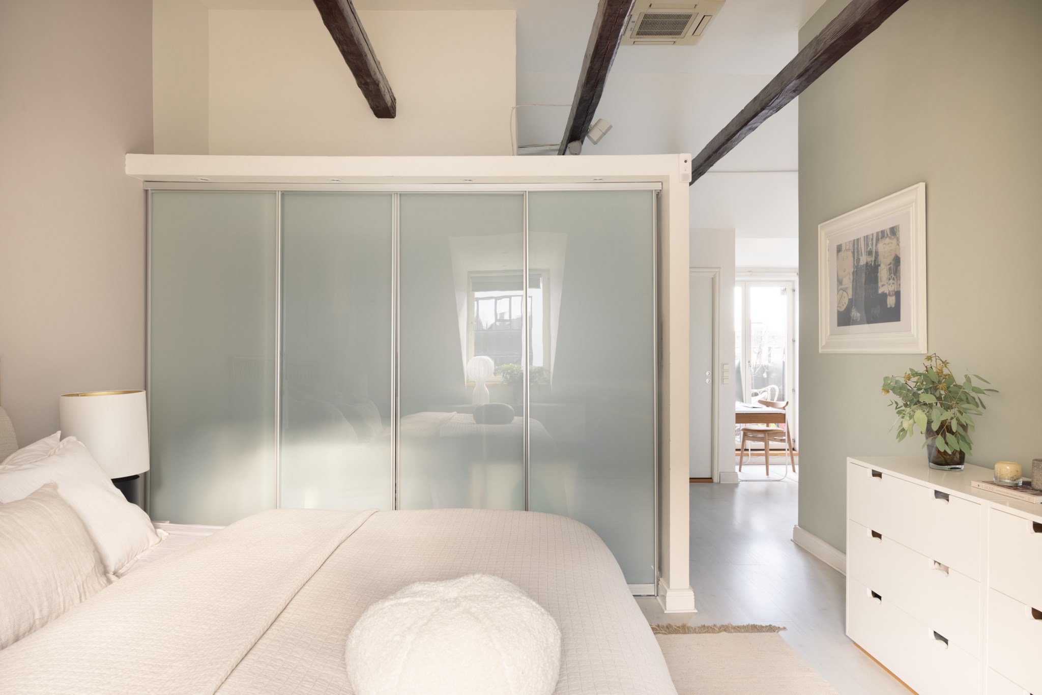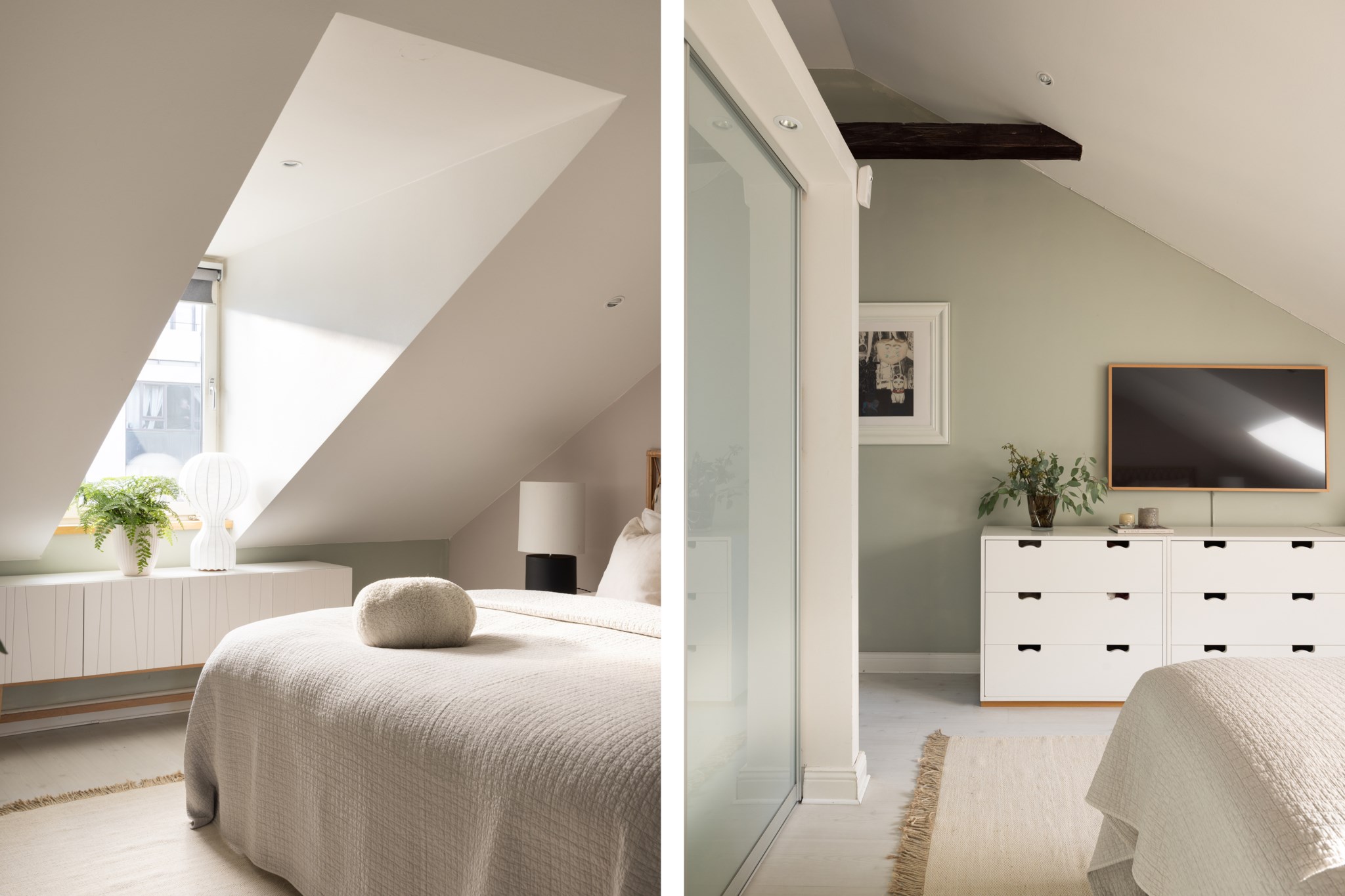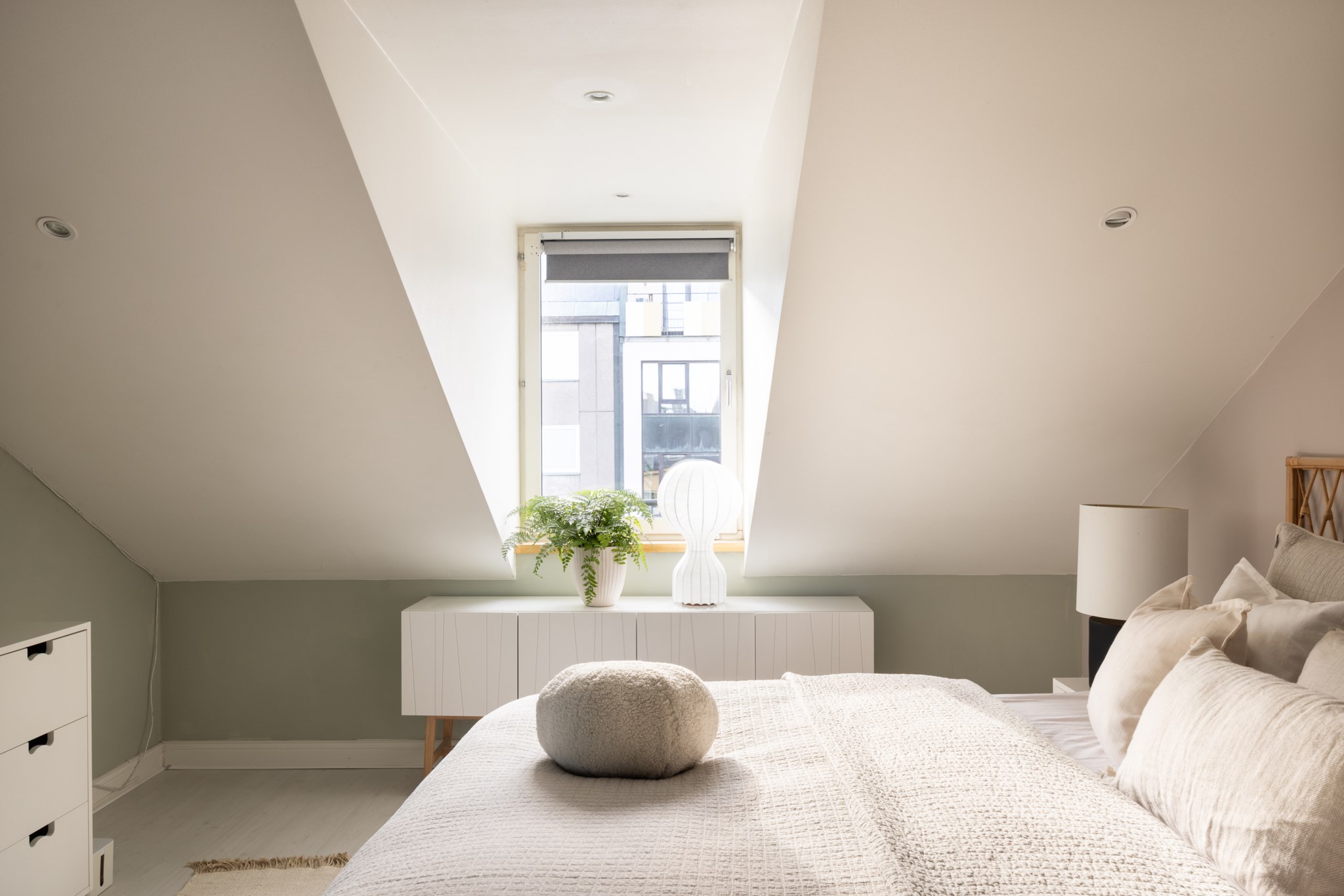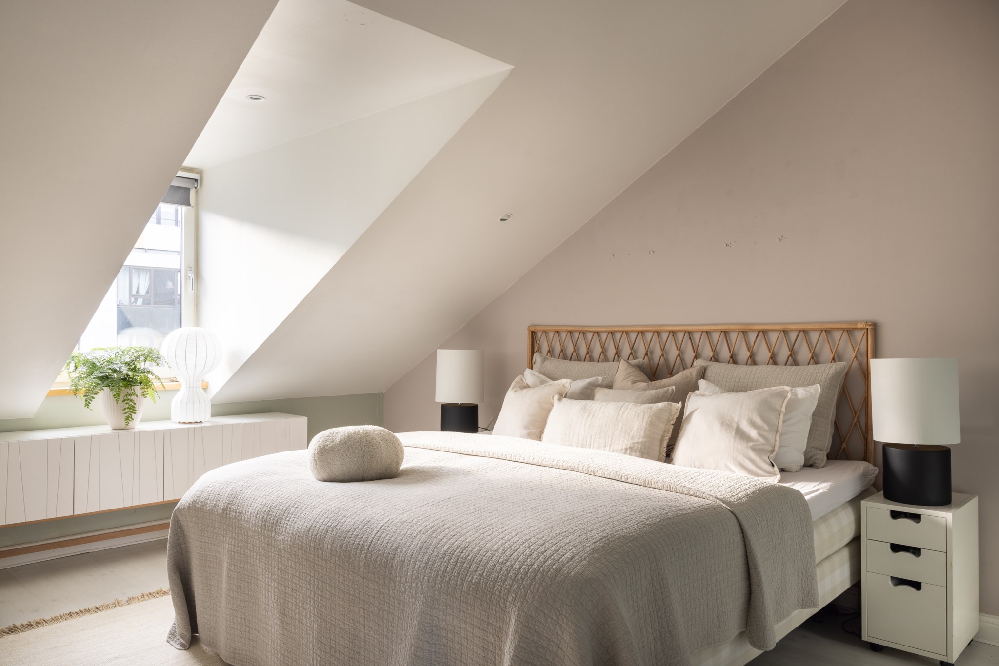 Stort sovrum med plats för fullstor säng, sängbord och annat efter önskemål. Tidlösa ytskikt bestående av ljusa väggar, ljust golv och detaljer i form av vackra takbalkar. Här finns gott om förvaringsmöjligheter via platsbyggd garderob. Ett härligt ljusinsläpp tar sig in via fönster.