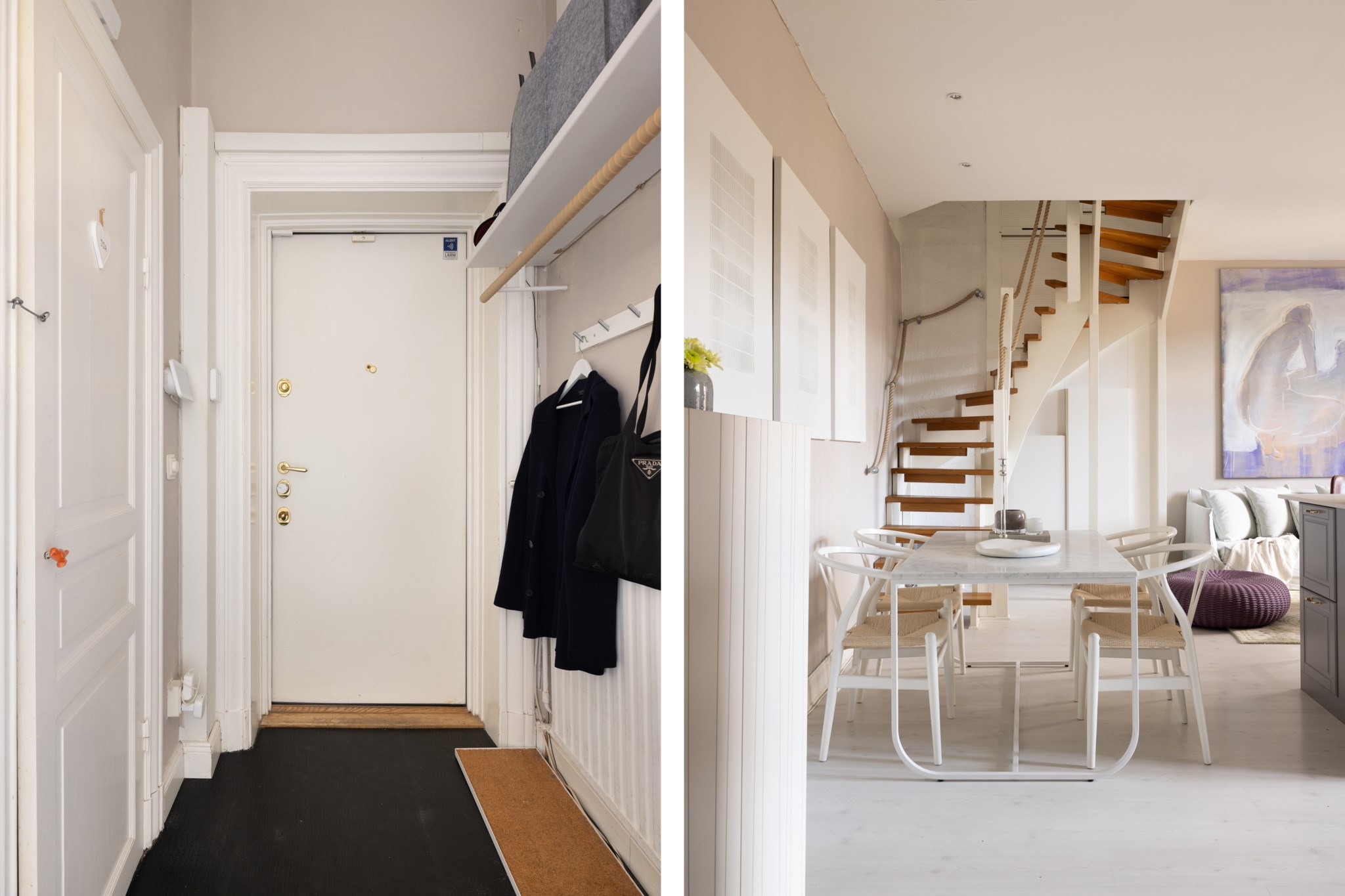 Välkomnande hall med gott om plats för avhängning och skoställ. Ytskikten består av väggar i ljusbeige nyans samt mörkt golv.