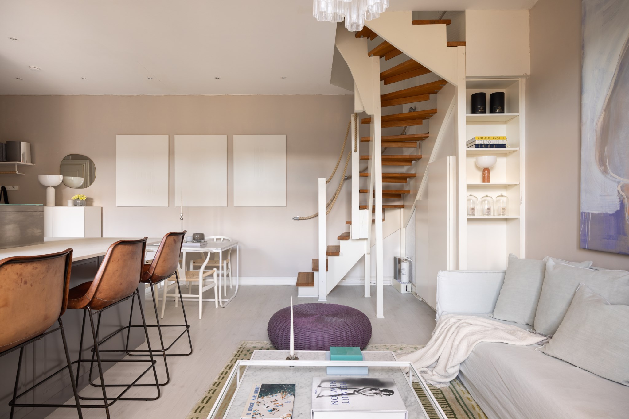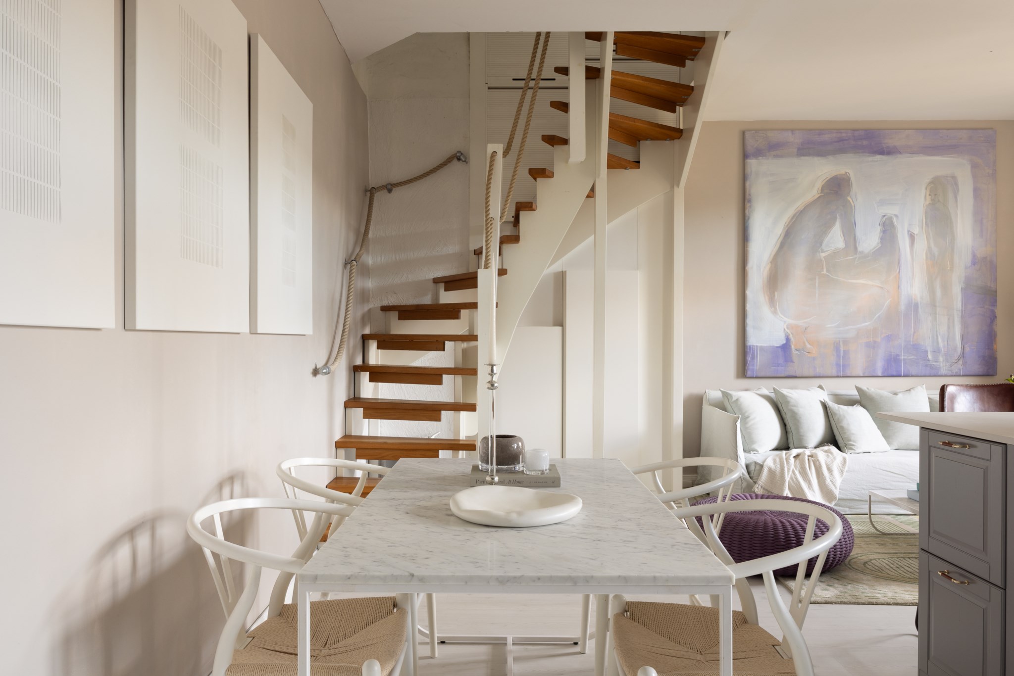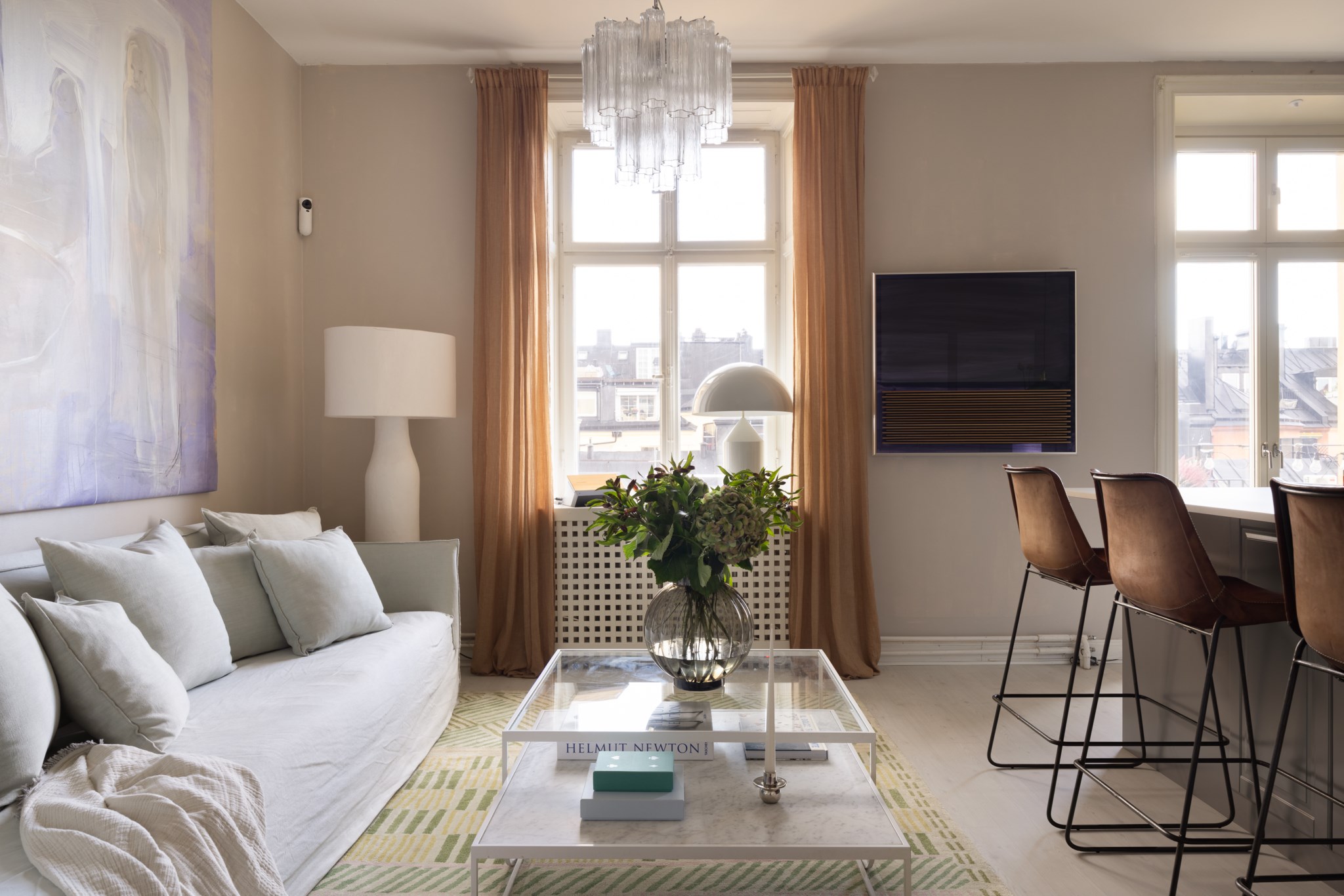 Luftigt vardagsrum i öppen och social planlösning med kök. Här möts du av ett generöst ljusinsläpp via stora fönsterpartier. Smakfulla ytskikt bestående av väggar i beige nyans samt ljust golv. I vardagsrummet inryms soffa, soffbord, matgrupp och annat efter smak och behov. Härifrån nås även trappan till övre plan.