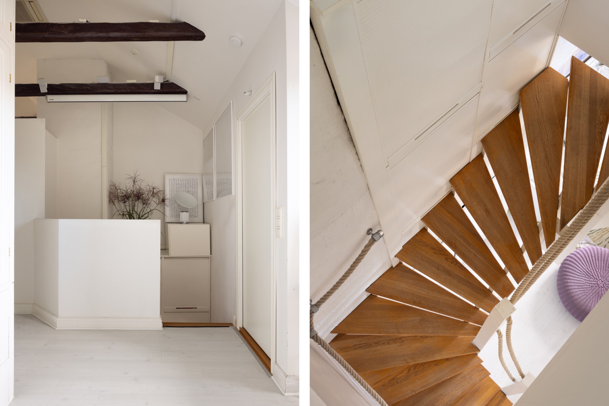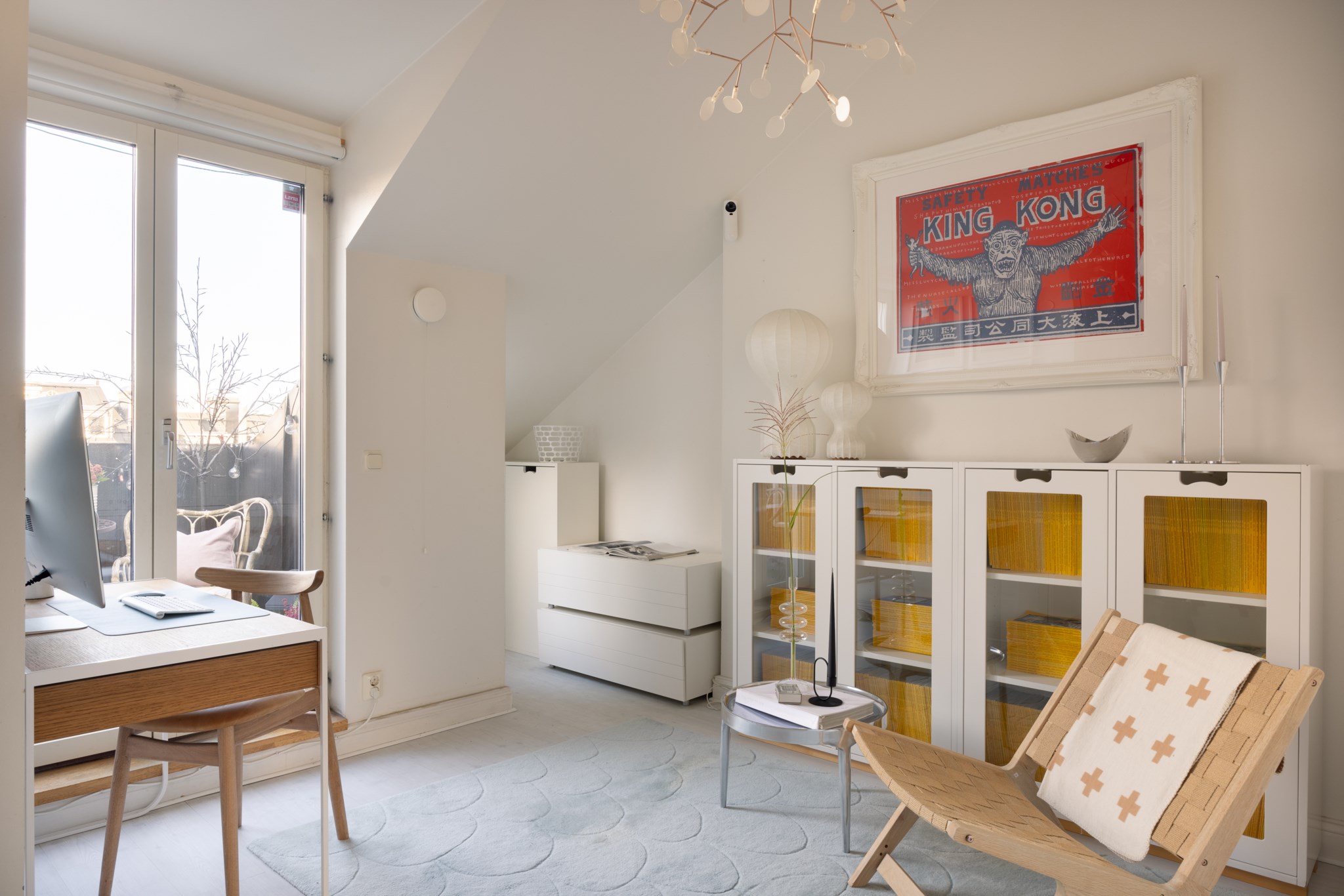 På övre plan möts du av ett allrum som med fördel kan nyttjas som kontor, gästrum eller TV-rum. Ytskikten består av ljusa väggar, ljust golv och vackra takbalkar. Generöst med förvaringsmöjligheter via stor garderob. Härifrån nås även terrassen via dubbeldörrar.