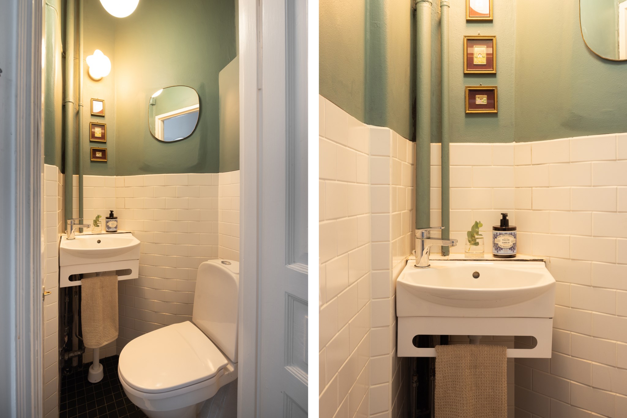 Intill hallen finns en perfekt placerat gäst-WC. Ytskikten består av väggar i en dov nyans och bröstning av vitt kakel samt mörkt klinker. Utrustat med WC och handfat.