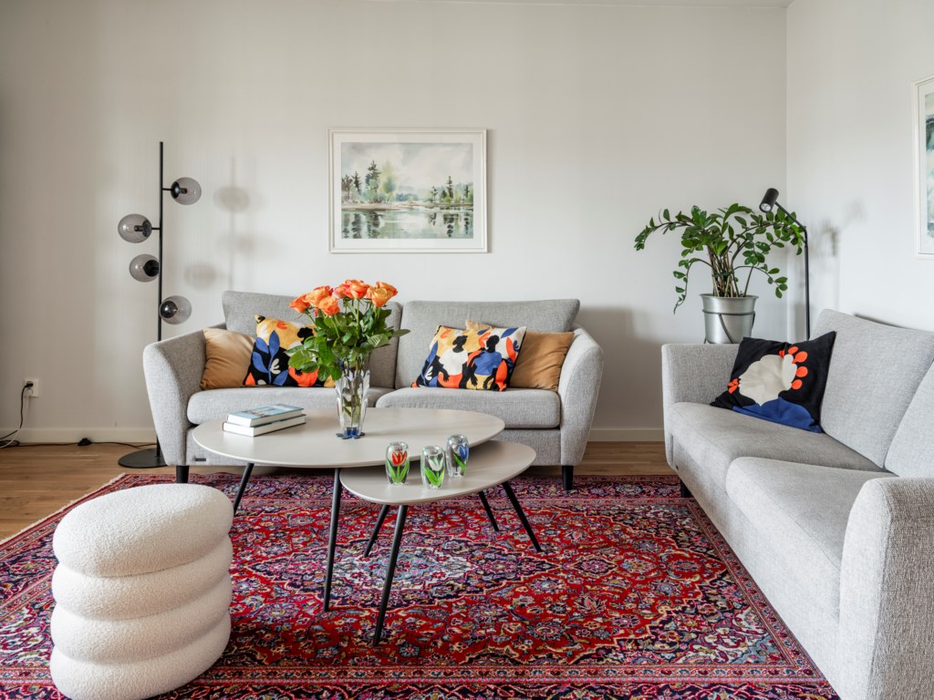 Köket är fräscht och socialt med vita skåpsluckor, mörk bänkskiva och köksö mot matplatsen. Fullt utrustat och med plats för sex personer. Bostaden rymmer två harmoniska sovrum med flexibla användningsmöjligheter samt ett helkaklat och välplanerat badrum med badkar/dusch, tvättmaskin och god förvaring.