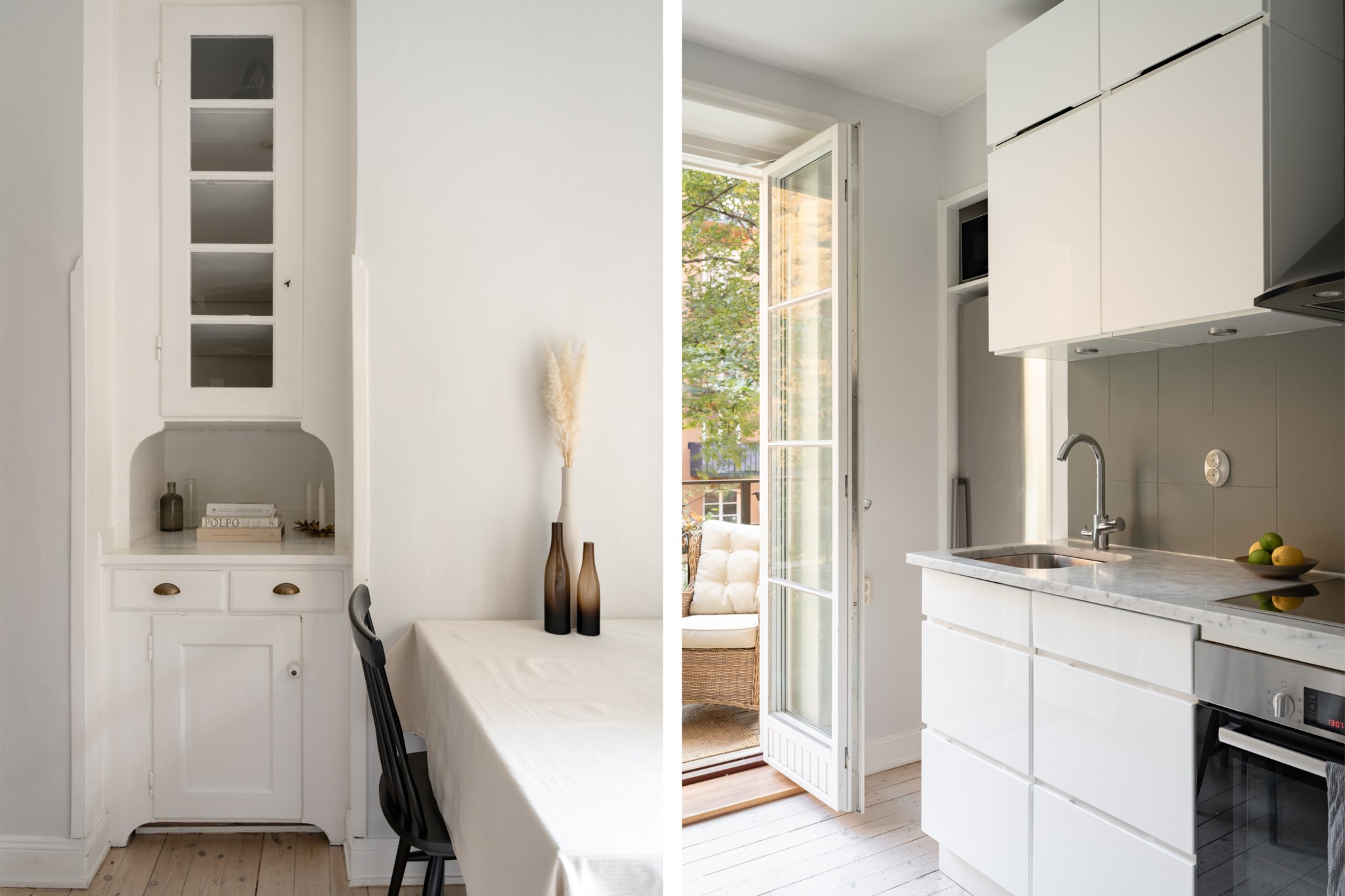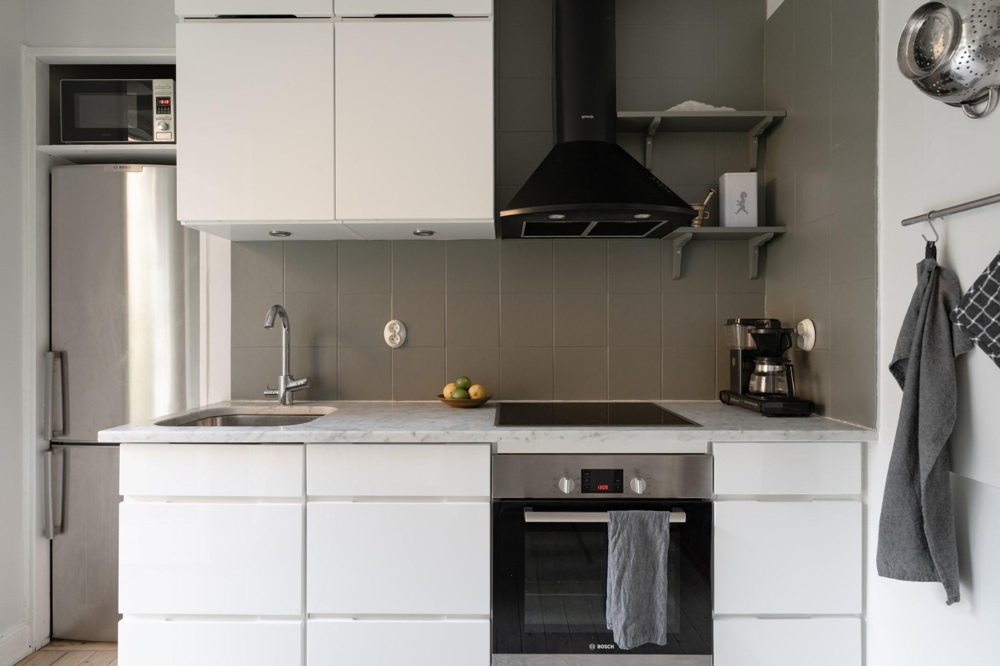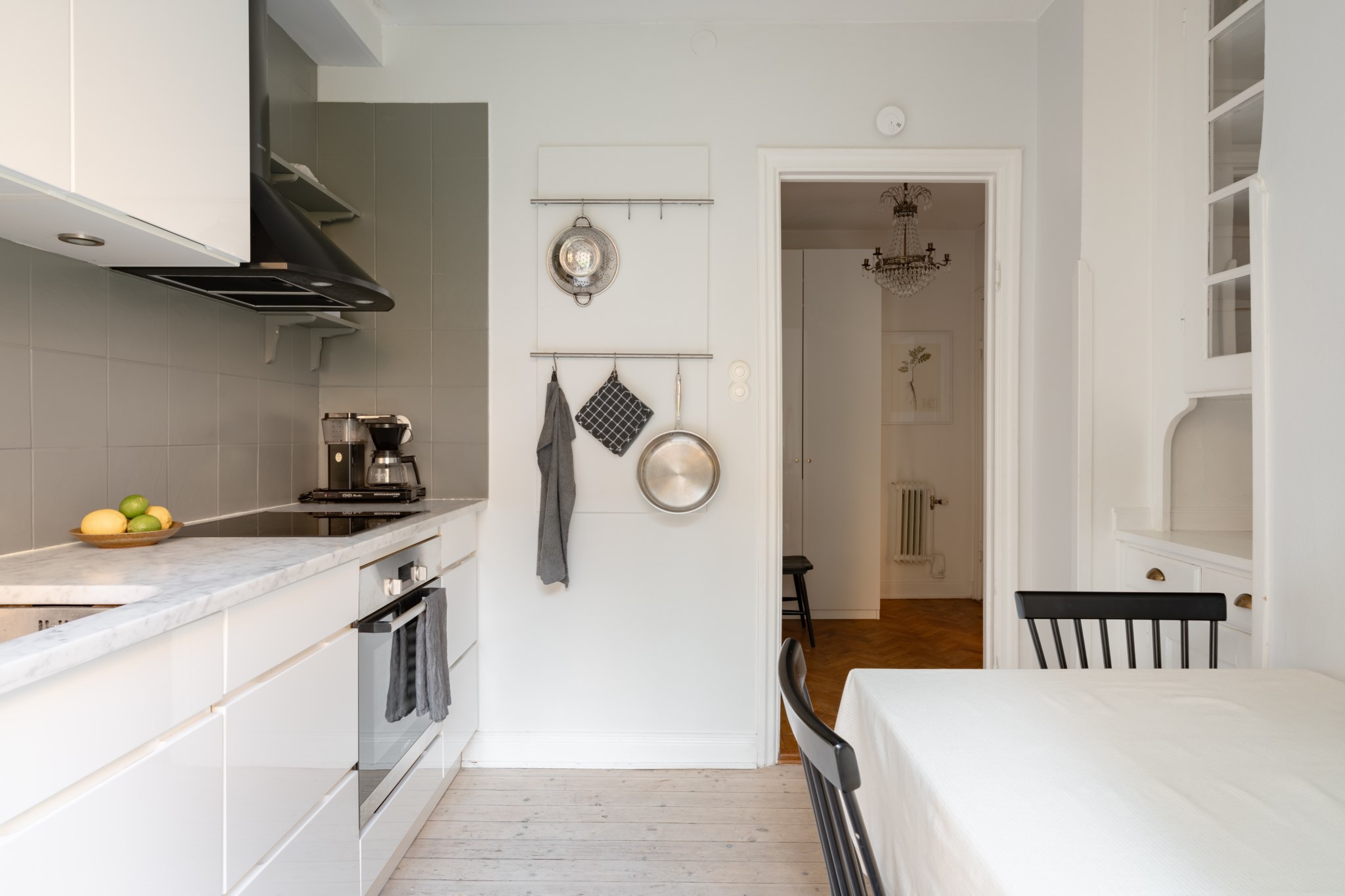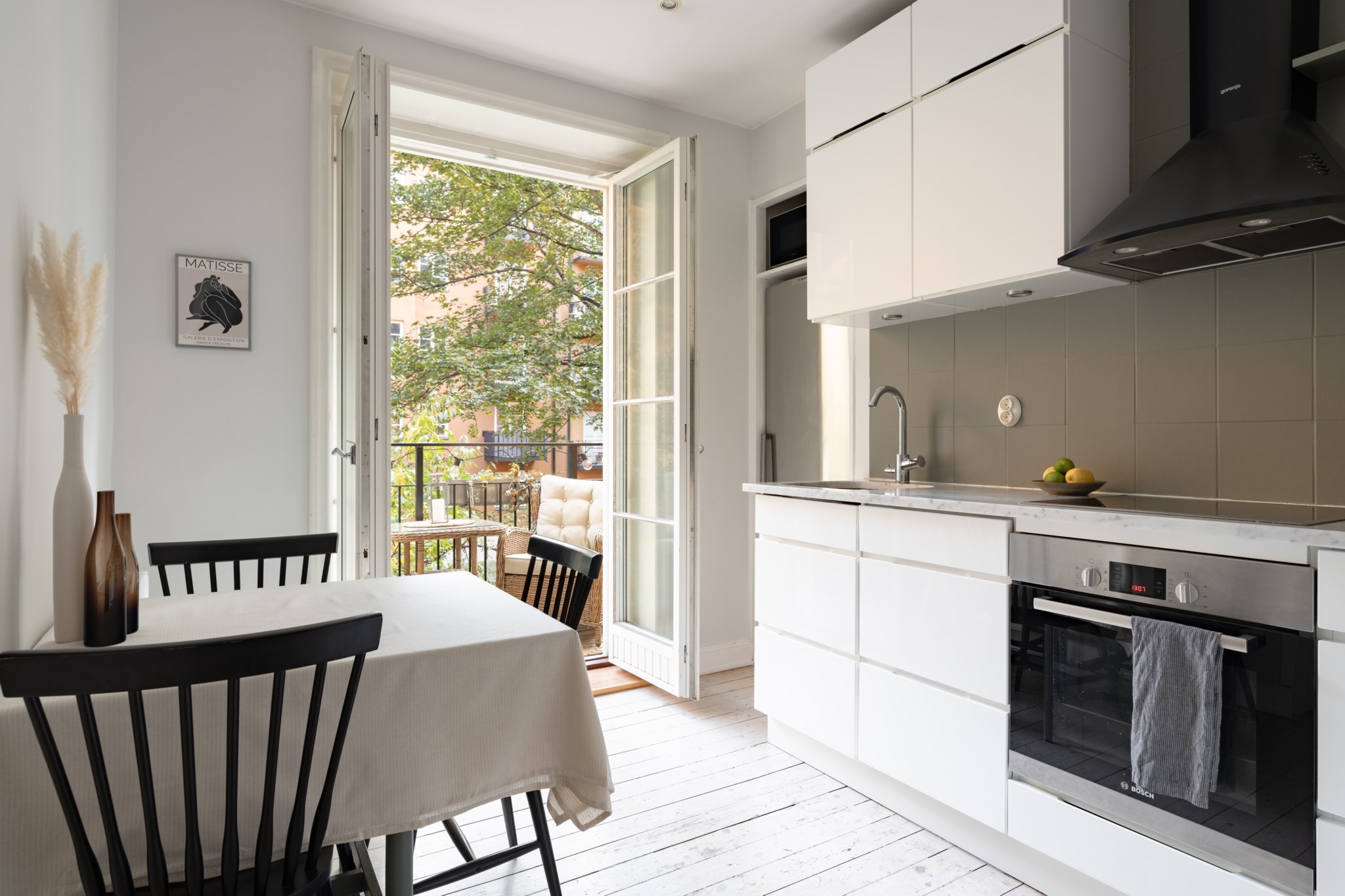 Modernt kök med ljusa skåpsluckor, kaklat stänkskydd och bänkskiva i carraramarmor. Utrustat med ung, fläkt, häll, diskho, mikro, kyl och frys. Ytskikten består av ljusa väggar och ljust golv. Plats för matgrupp och övrigt möblemang efter önskemål.