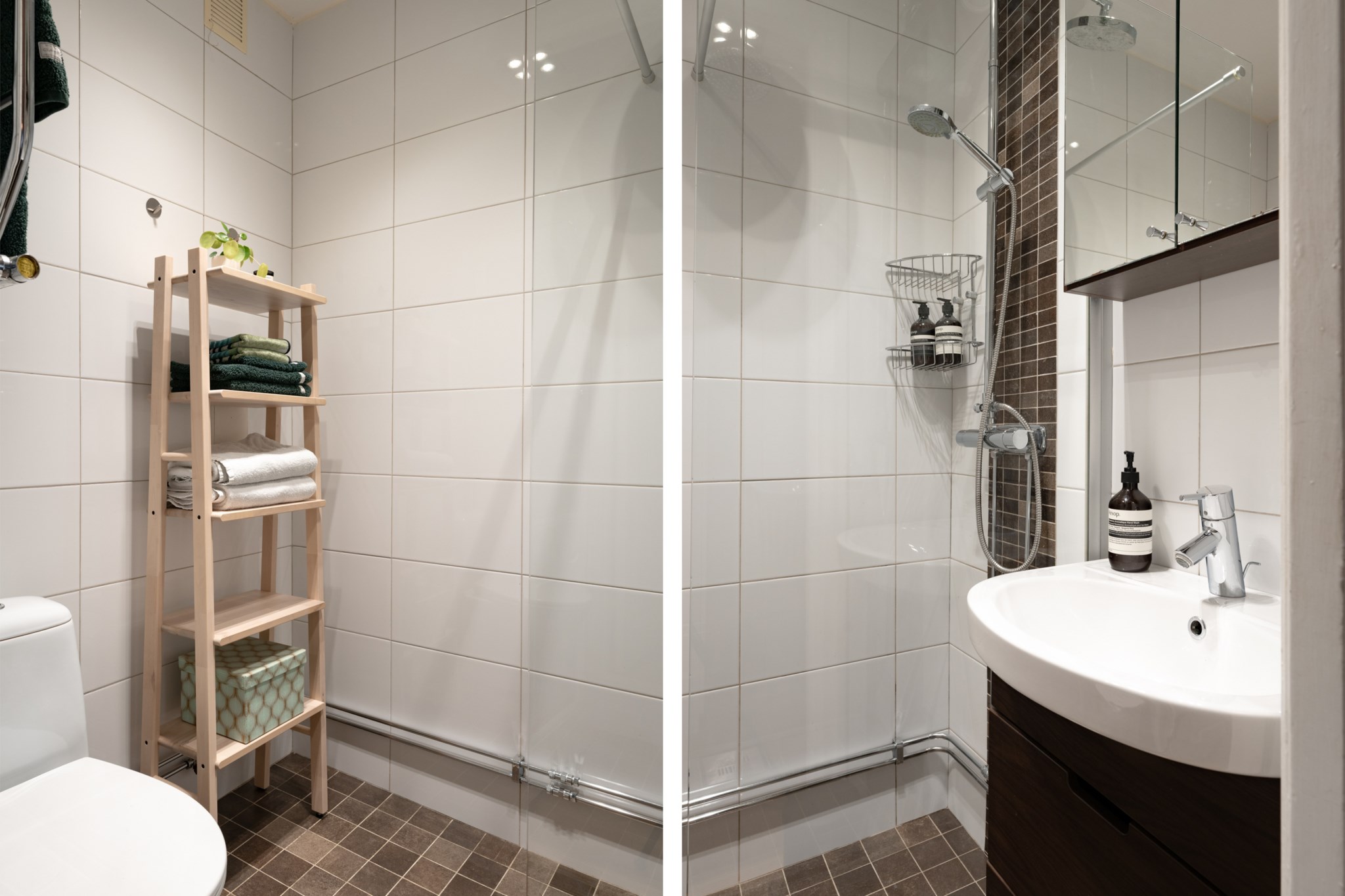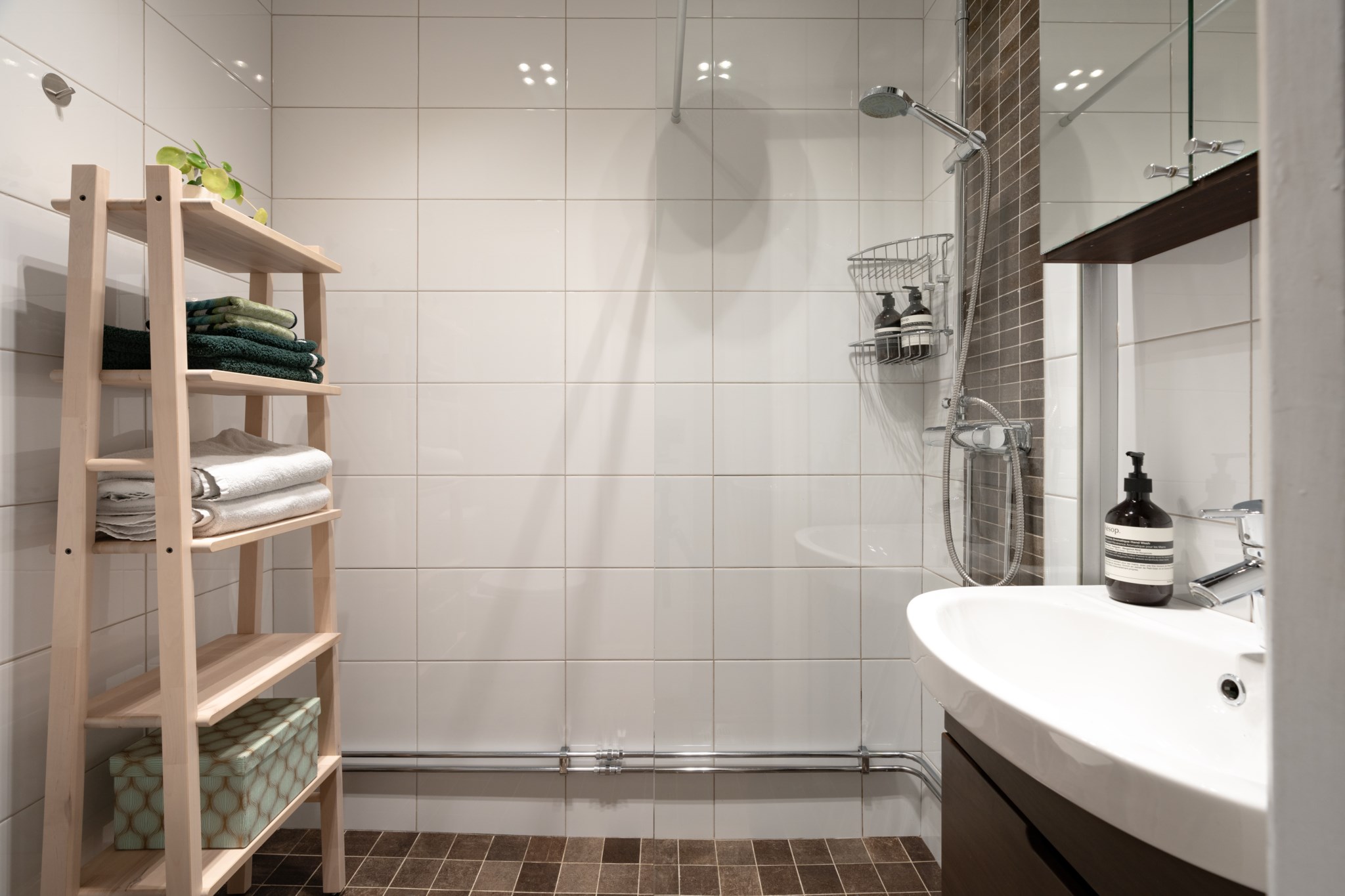 Stort badrum med vitt kakel och mörkt klinker. Badrummet är utrustat med WC, dusch med glasvägg, handfat i kommod, handdukstork, spegelskåp med belysning. Perfekt belysning via spotlights i tak.
