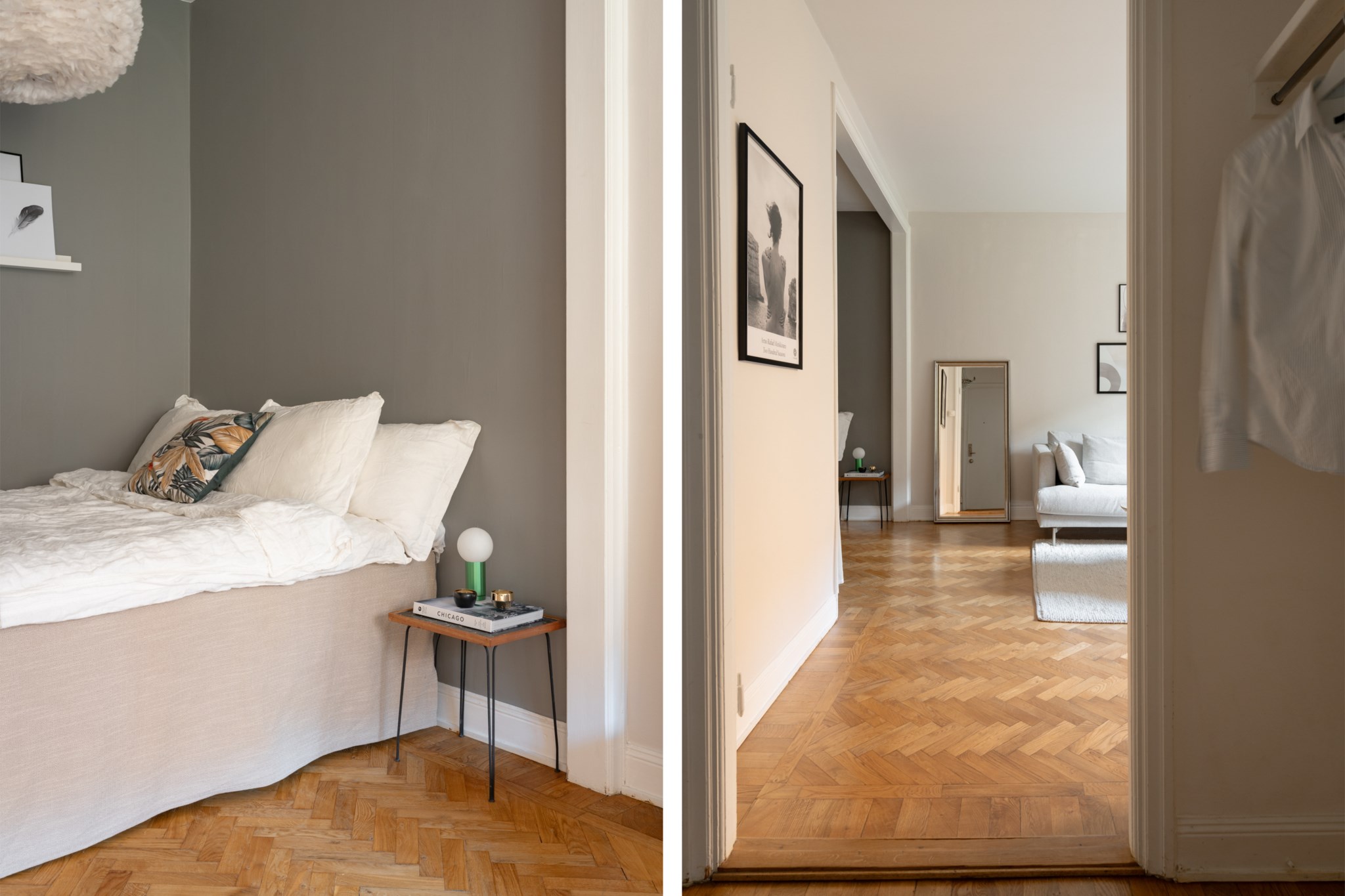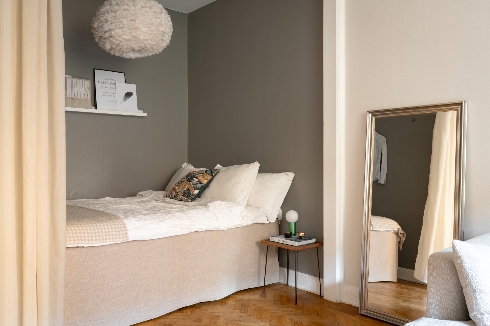 Mysig sovalkov med plats för större säng och annat möblemang efter smak och behov. Ytskikten består av mörka väggar och fiskbensparkett.