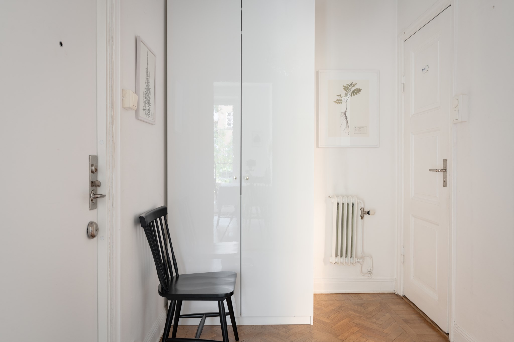 Rymlig och välkomnande hall med plats för avhängning genom en garderob, här finns plats för ett skoställ och mindre avlastningsmöblemang efter önskemål. Ytskikten består av ljusa väggar och fiskbensparkett.