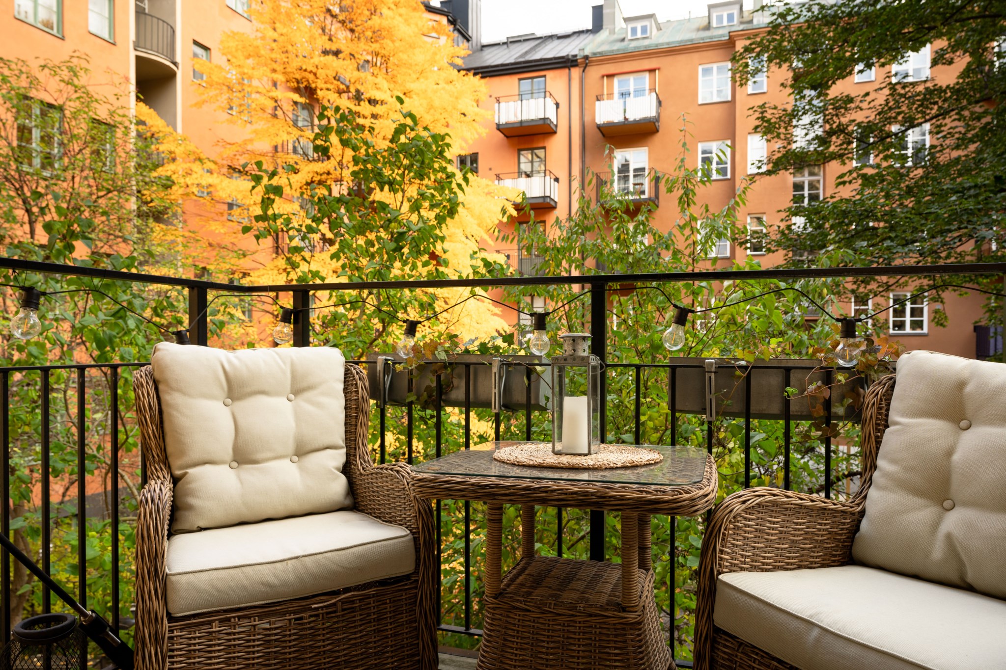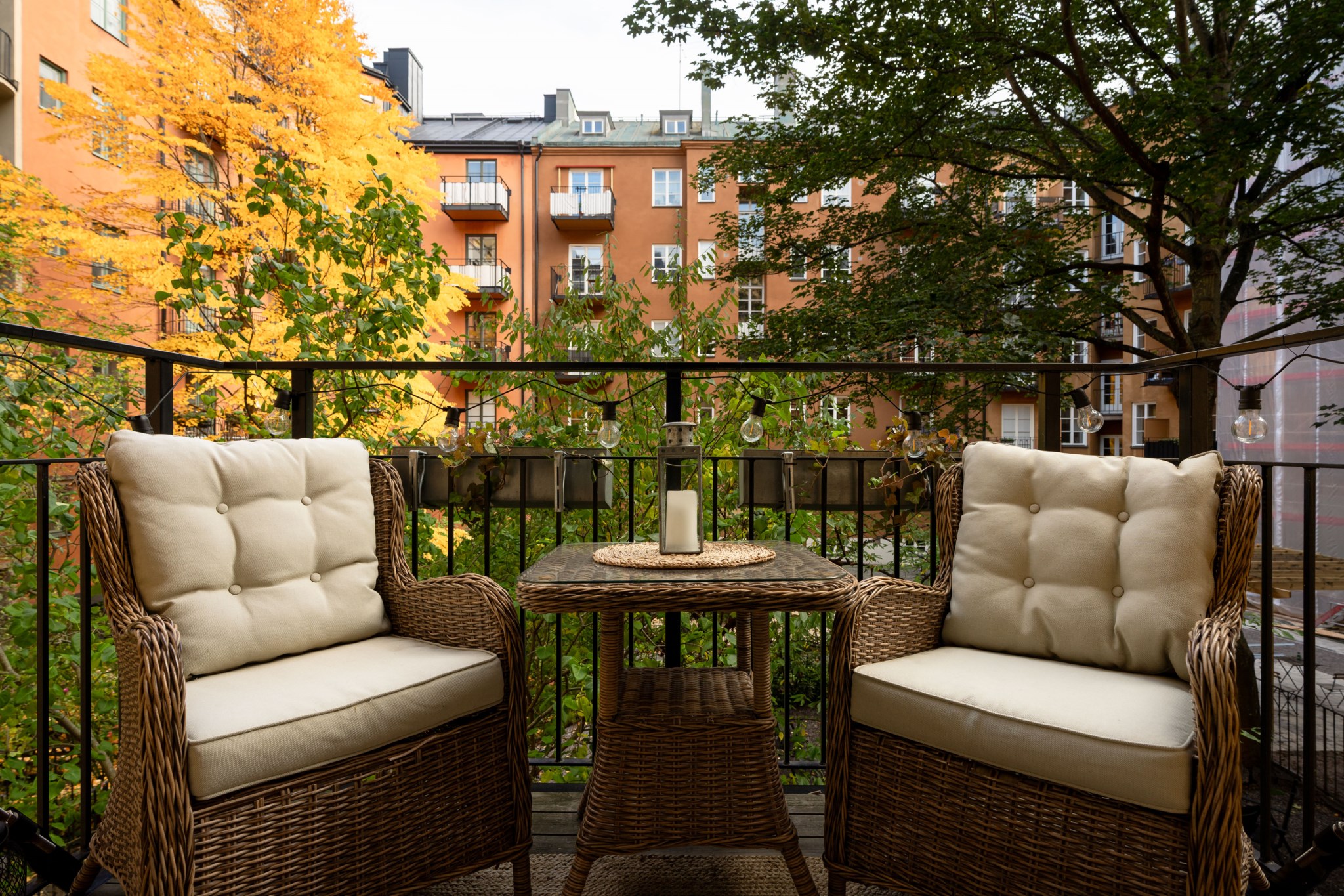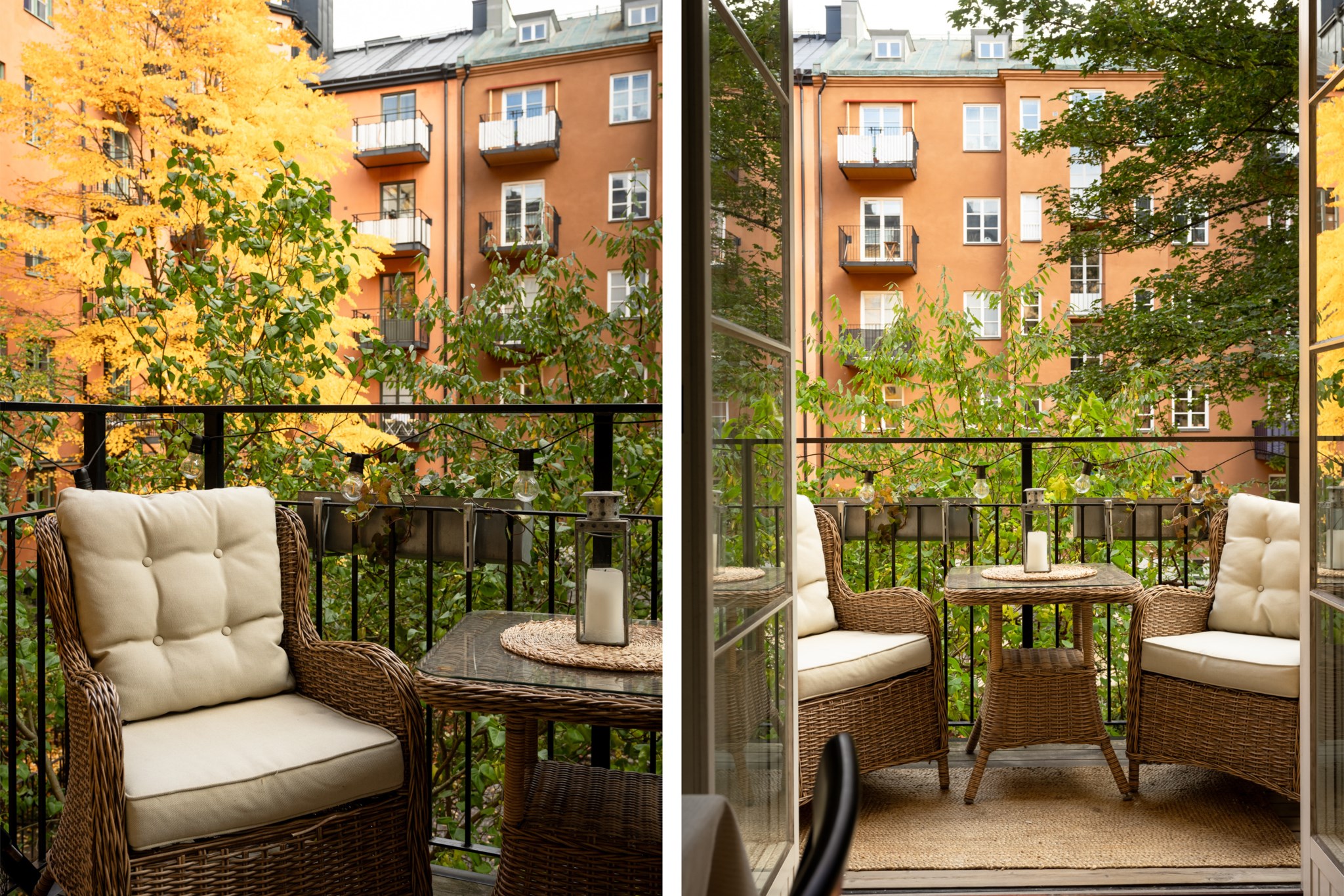 Fantastisk balkong mot blomstrande innergård. Vackert svart smidesräcke. Plats för cafébord med tillhörande stolar samt planteringar om så önskas. Välkommen att skapa din egen oas!